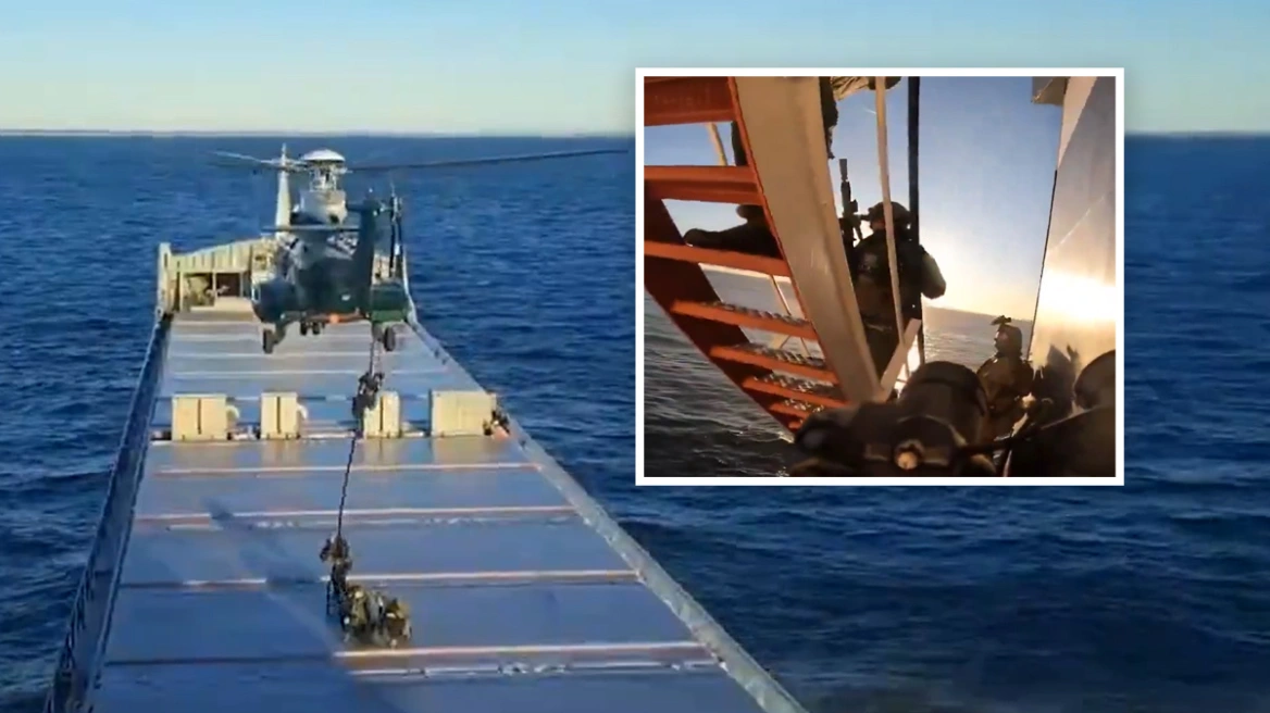 Στις εικόνες φαίνεται ένα ελικόπτερο να πλησιάζει το πλοίο και ένοπλοι άνδρες να κατεβαίνουν στο κατάστρωμα με σκοινί