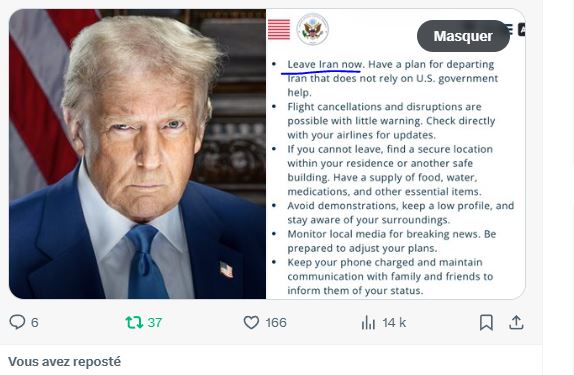 🇺🇸 L’Ambassade des États-Unis appelle ses citoyens à QUITTER L’IRAN IMMÉDIATEMENT. pic.twitter.com/IvSl769Ji6