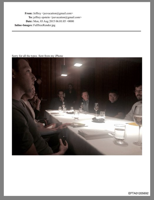 Ο Τζέφρι Έπσταϊν τράβηξε μια φωτογραφία από το δείπνο στο οποίο παρευρέθηκε το 2015, στο οποίο παρευρέθηκαν οι Έλον Μασκ, Πίτερ Θέιλ ( συνιδρυτής του PayPal που δίνει πριβές διαλέξεις για ”Αντίχριστο”), Μαρκ Ζάκερμπεργκ (Αμερικανός εβραϊκής καταγωγής δημιουργός του Facebook), Ριντ Χόφμαν ( συνιδρυτής του LinkedIn) και άλλοι….